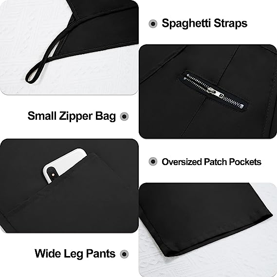 • Features: solid color classic V-neck overalls, women's sleeveless jumpsuit with thin shoulder straps, casual loose fit design, large patch pockets on both sides, convenient for carrying mobile phones, keys and other items. A small zip pocket on the back adds to the aesthetic. Suspender jumpsuit, black overalls, spaghetti strap jumpsuit, V-neck overalls, summer casual suspenders.